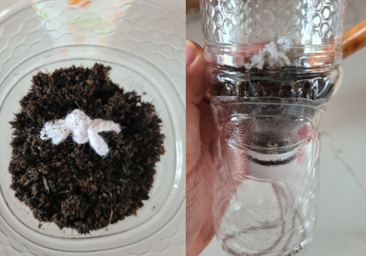 4. Add in soil in the top half of the bottle. Make sure to pull through some rope in the soil (this is so that water can reach the top of the soil too). Add water to the bottom half of the bottle.